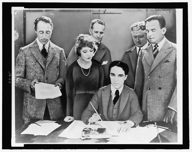 D.W. Griffith, Mary Pickford, Charlie Chaplin (seated) and Douglas Fairbanks at the signing of the contract establishing United Artists motion picture studio (LOC)